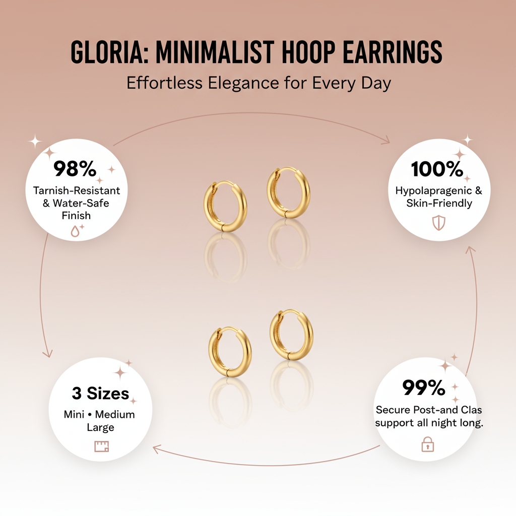 โข 14K gold plating over durable brass core โข Hypoallergenic finish reduces irritation โข Tarnish-resistant and water-resistant โข Lightweight with secure post-back clasp